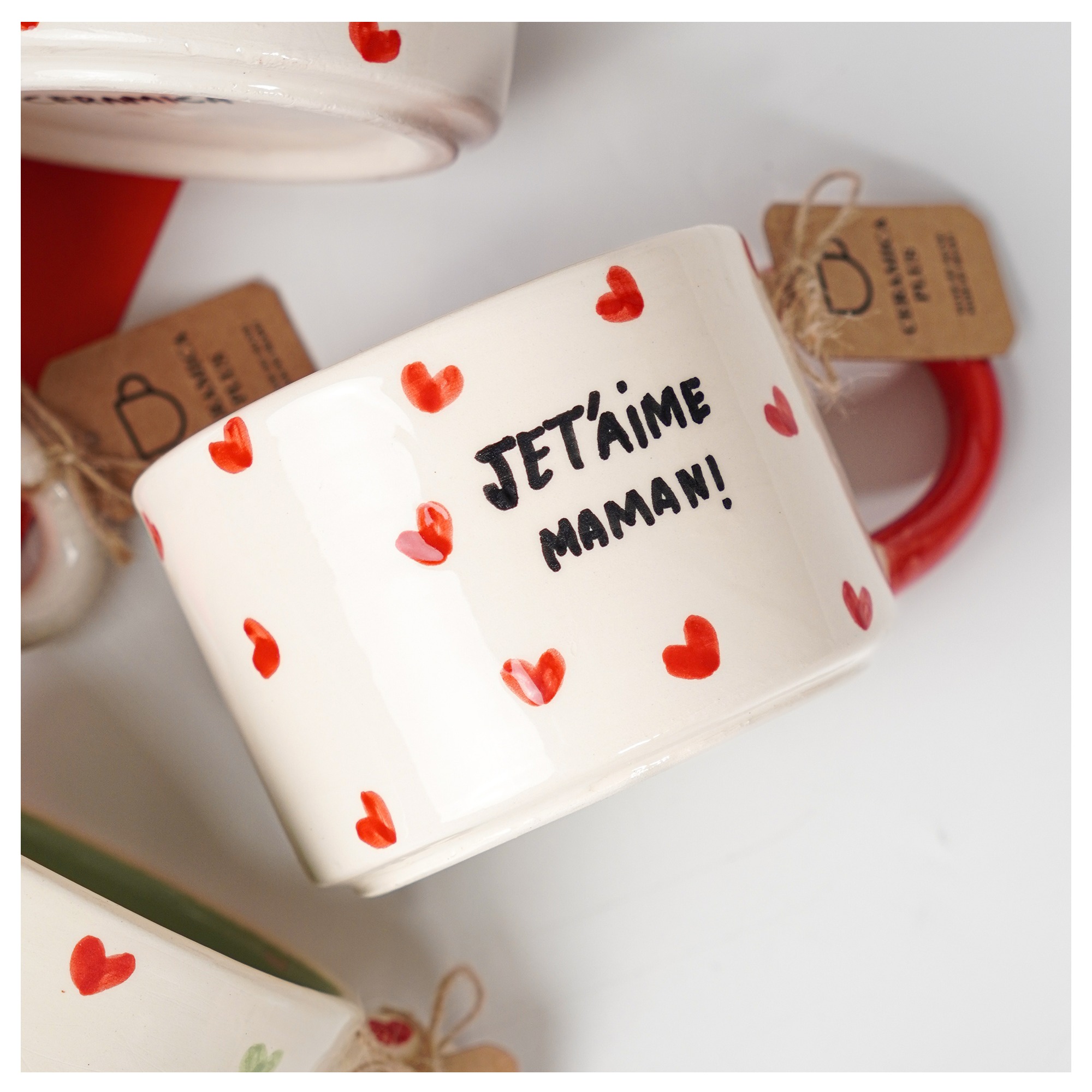 Ce modèle a touché le cœur de nombreuses clientes : le mug personnalisé Je t’aime Maman est un hommage à la tendresse maternelle. Fait main, décoré avec des petits cœurs, il est autant apprécié pour son design que pour sa charge émotionnelle.