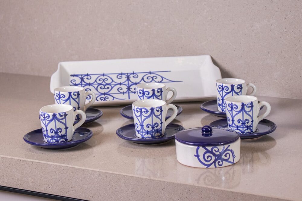 Quand le motif et les couleurs illustrent la madina et l’antiquité tunisienne, la joie et le bonheur envahissent votre pause café. Habillez votre table avec ce magnifique service à café en poterie au motif de fer forgé en bleu. Il est composé de 15 pièces : 6 tasses, 6 sous tasses, 1 plateau rectangulaire (14,5cm*37cm), 1 bonbonnière (diamètre 10cm) et 1 couvercle.