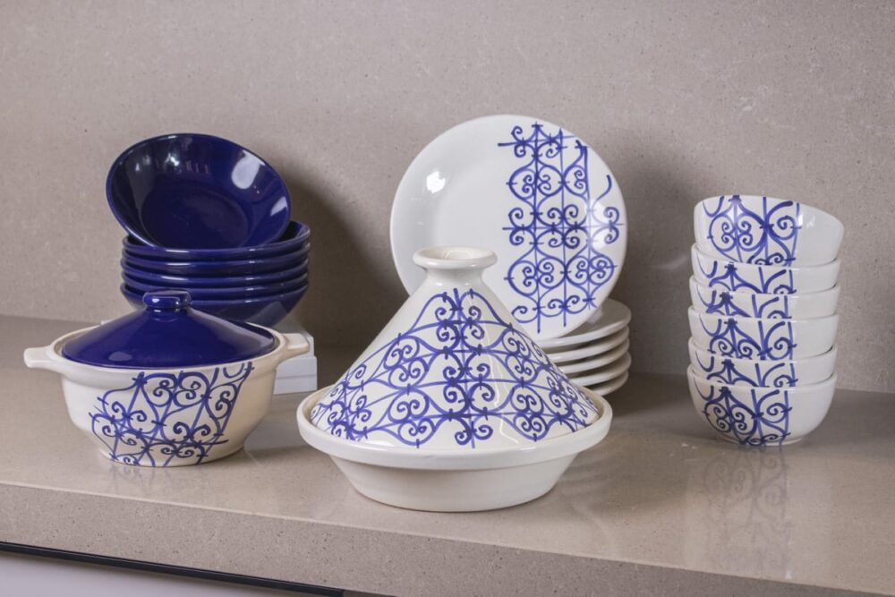 Ajoutez une touche tunisienne à votre table avec notre service en poterie au motif de fer forgé bleu, inspiré de la madina et de l’antiquité tunisienne. Ce service apportera une note de joie et de bonheur à votre dîner. Composé de 22 pièces raffinées, il inclut : 6 bols, 6 assiettes creuses, 6 assiettes plates, 1 soupière, 1 tajine et 2 couvercles. Commandez dès maintenant pour transformer vos repas en moments inoubliables !